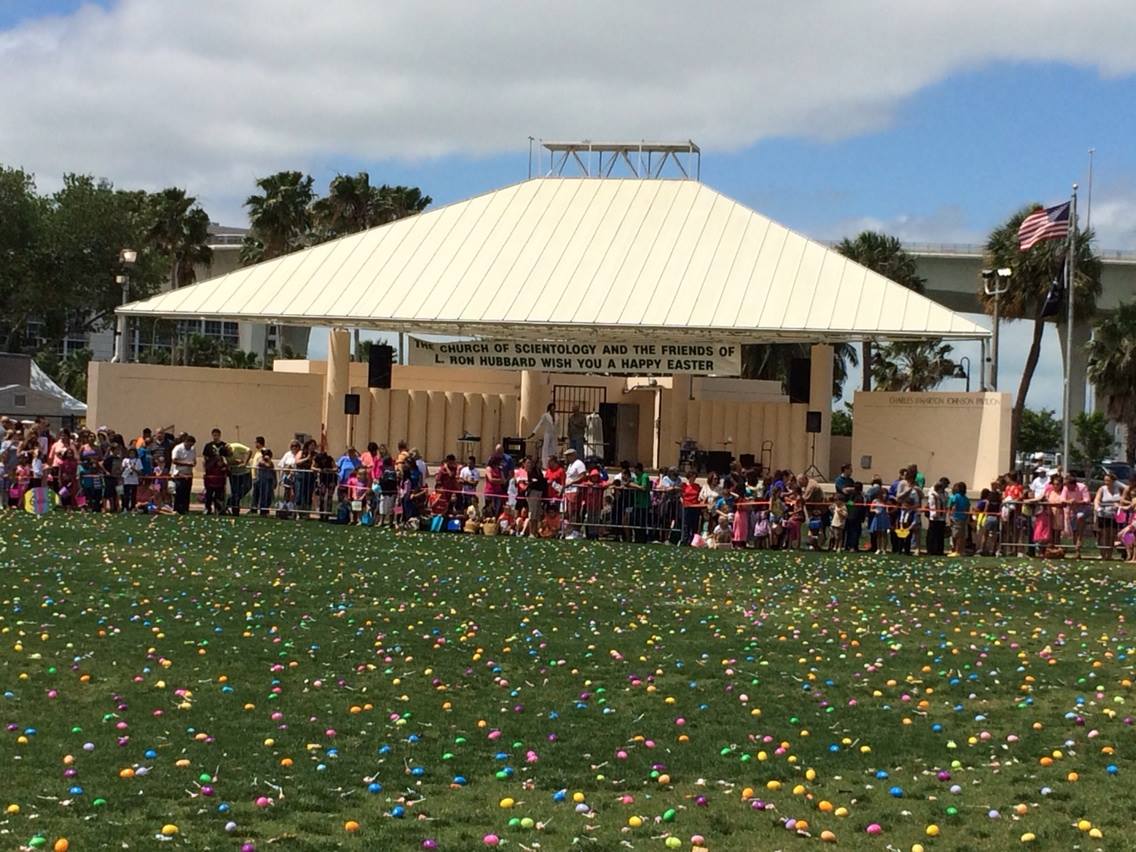 We got there early, since I figured there would be thousands of kids vying for the thousands of eggs. I was right. The park was packed. There was a giant slide and a little train and even pony rides. On the stage, a guy dressed up as Elvis Presley was lip-syncing to The King’s classics (his daughter, Lisa Marie, is a Scientologist). We walked around the cordoned egg area – so much for an “egg hunt,” the eggs were just thrown around on the ground – and found a place on the far side, just in front of a tent stocked full of L. Ron Hubbard books.
