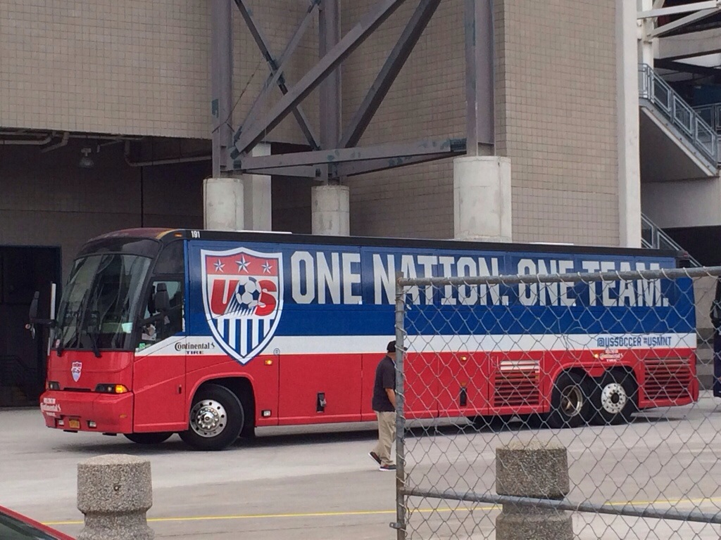 With happy, full tummies we drove the 15 minutes to the stadium. Well, it should have taken 15 minutes…. with the soccer traffic it took more like 40 minutes. As we passed the exit for the West side of the stadium, G asked where our seats were. Hell if I knew. I pulled up a map of the stadium and what do you know, our seats were on the West side. It took another 15 minutes to get to the East side exit. But it was just as well that we missed our exit, because just as we made the turn in front of the stadium, the bus carrying the U.S. Team arrived!